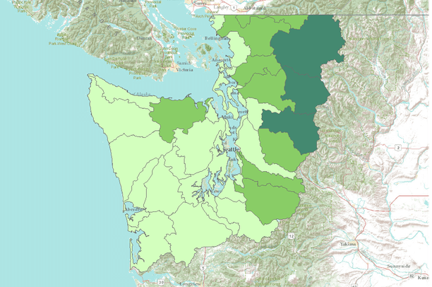 Cumulative Projected Changes in Freshwater Ecosystems of Western Washington Summarized by HUC 4. Based on ratio of snow water equivalent to Oct-Mar precipitation; Q1.5 channel forming flows; center of timing of flows; water temperature; and 7q10 low flow projections for 2040s.